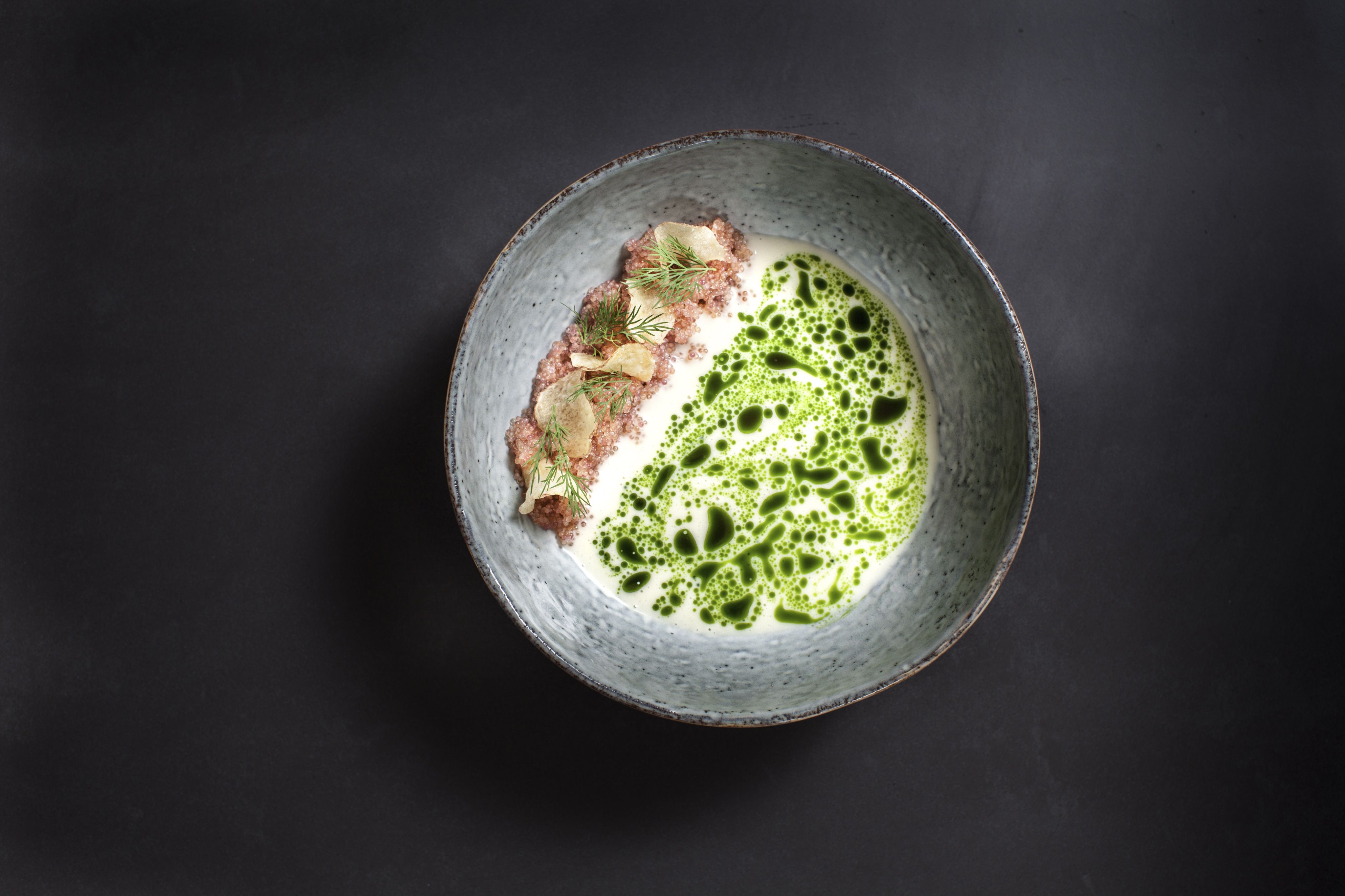 med syrligt æble, friskbælgede ærter, forglem mig ej og sauce på fed fløde skilt med dildolie.
