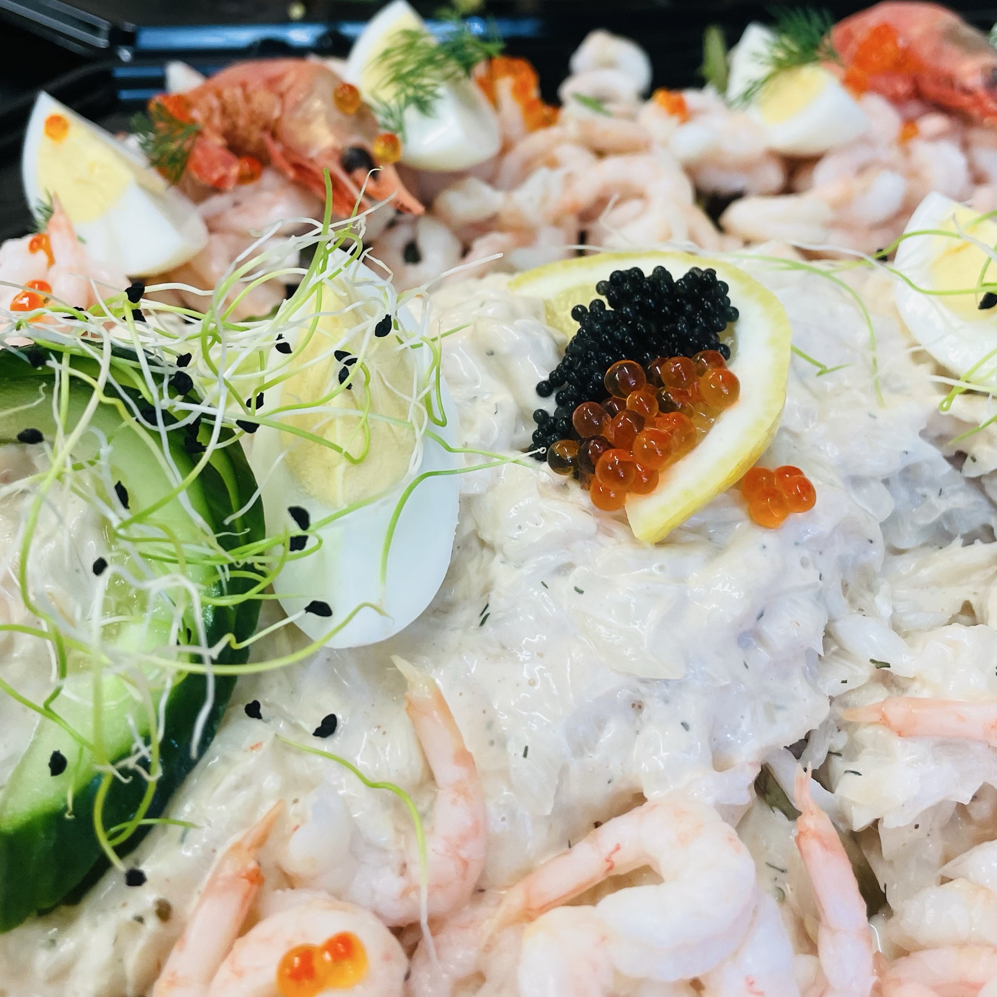 Torskefad med æg, rejer, krebs. inkl. dressing.