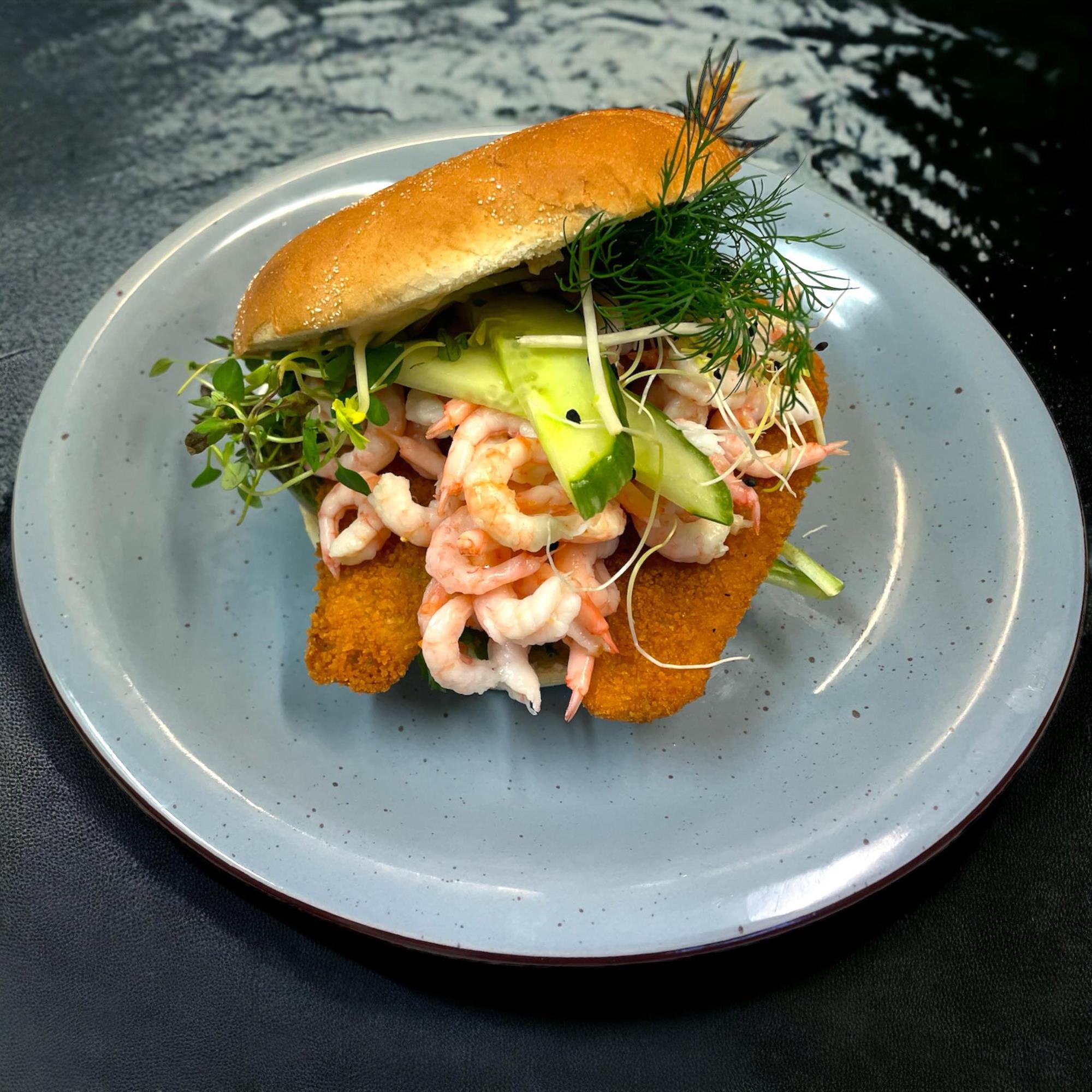 Nyd vores velsmagende sandwich med saftig stegt rødspættefilet, håndpillede rejer og dagens friske grøntsager. Den møre rødspættefilet er perfekt stegt og komplimenteres af de delikate rejer og sprøde grøntsager. Hver bid af denne sandwich er en smagsoplevelse, der balancerer havets friskhed med en pikant kombination af teksturer.