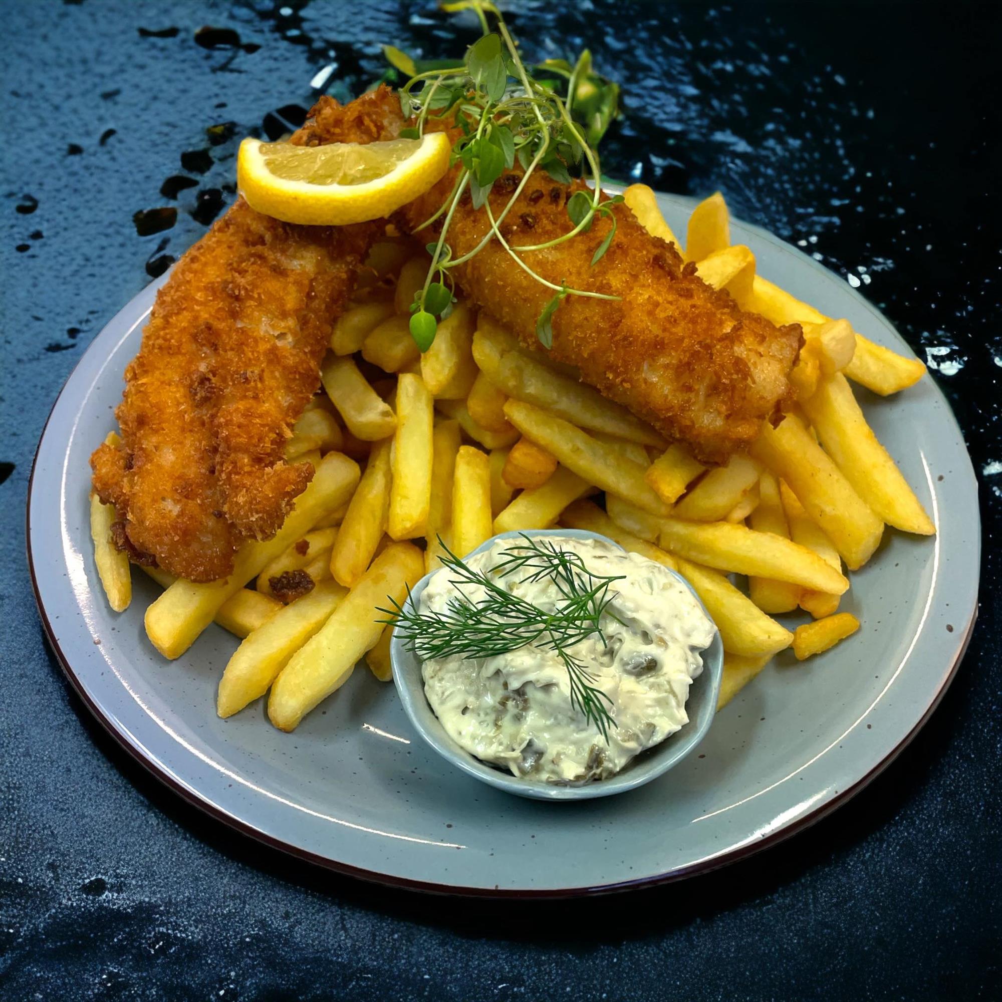 Forestil dig en klassisk favorit med et dansk twist - vores fish n' chips lavet med delikat kuller, fanget fra de dybe farvande i Danmark. Hver bid af vores fisk er indhyllet i en sprød og luftig panko-rasppanering, der fremhæver den friske smag og saftigheden af kulleren. Ved siden af serveres sprøde, gyldne pommes frites, perfekt til at supplere den friske fisk.