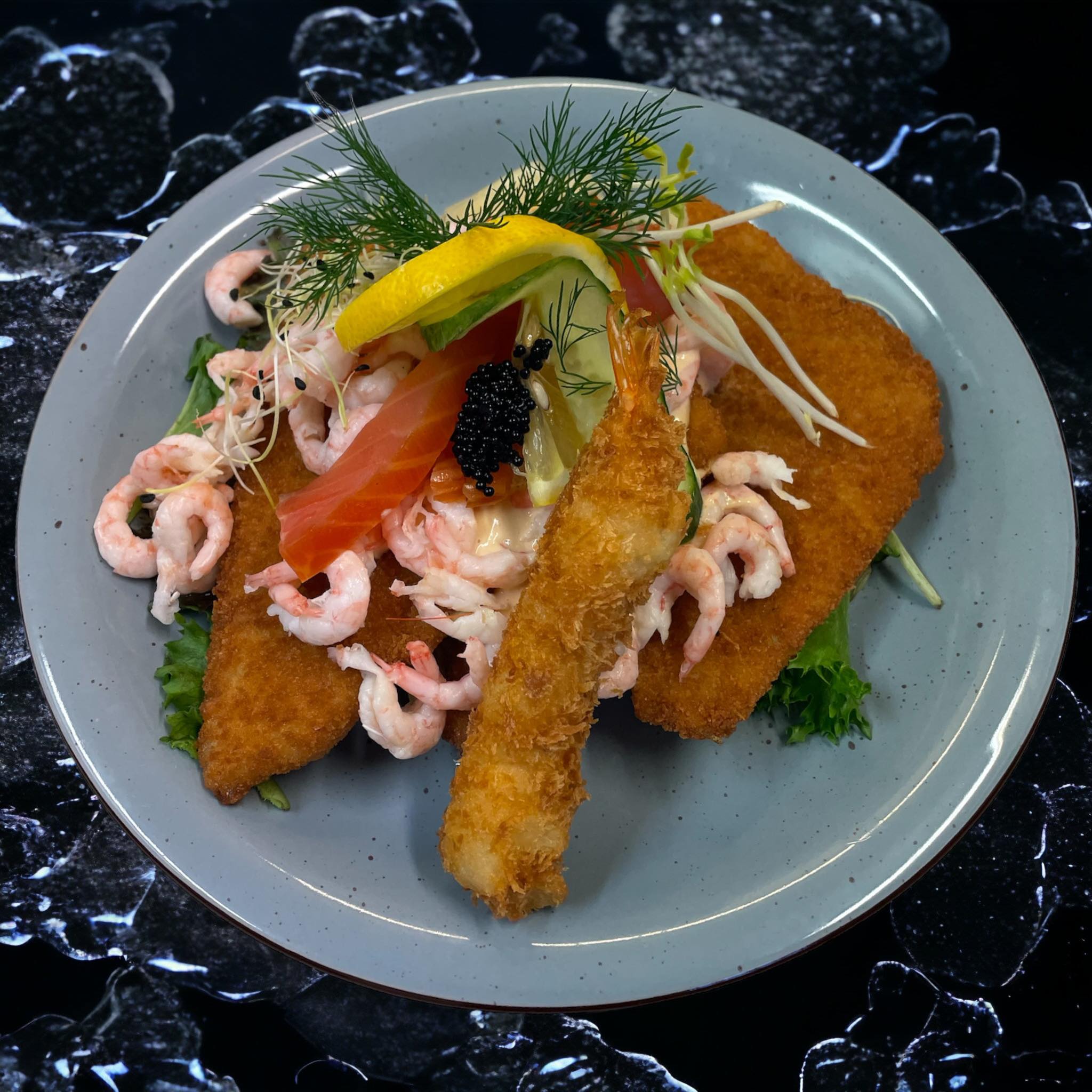 3 stegte rødspættefileter, håndpillede rejer, asparges, laks, panko rejer, lakserogn og dressing