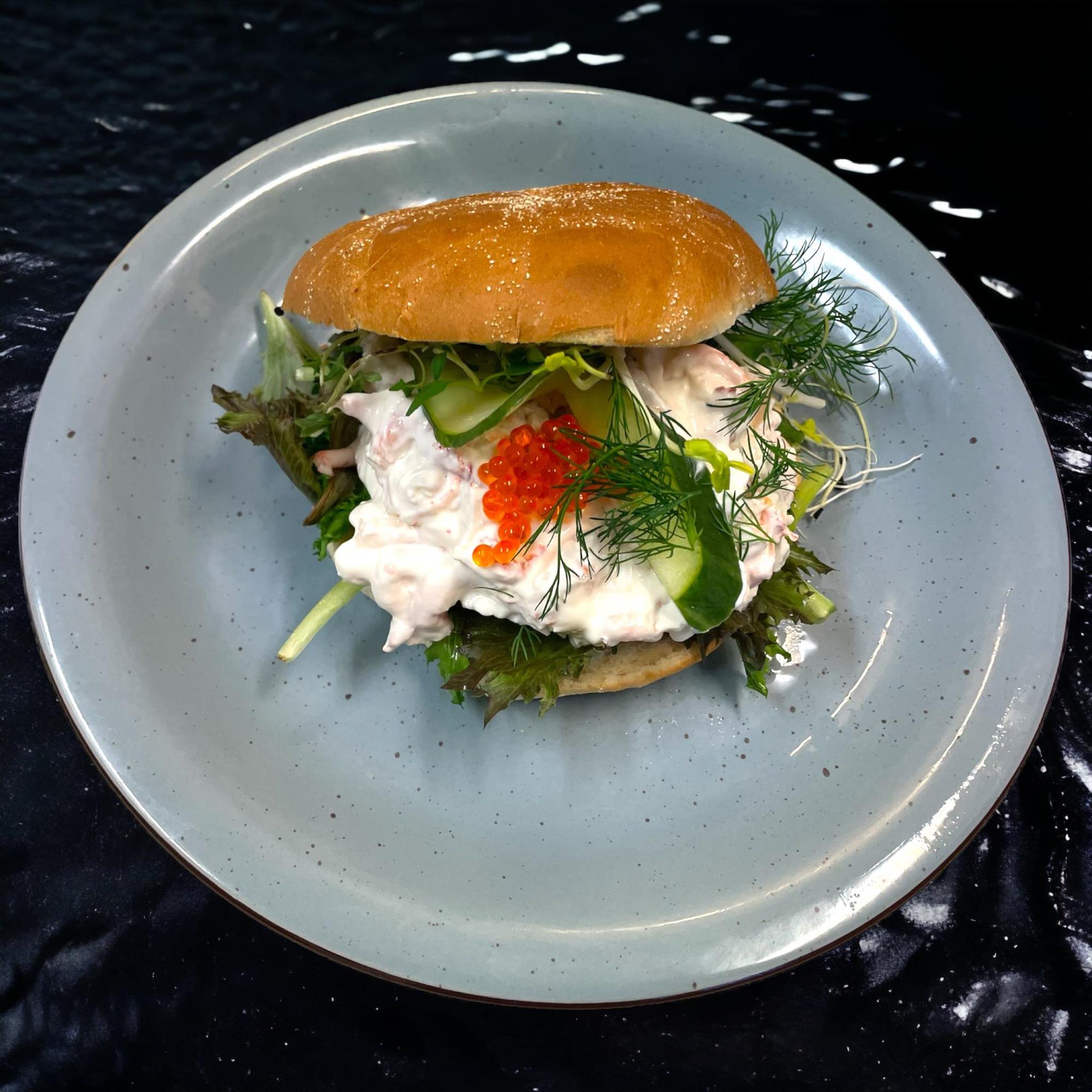 Nyd en smagsoplevelse fra havet med vores lækre hjemmelavede skaldyrsalat-sandwich, perfekt tilberedt med dagens friske grøntsager. Vores skaldyrsalat, lavet med omhu og kærlighed, er fyldt med saftige bidder af skaldyr og en cremet dressing, der komplimenteres perfekt af dagens grønne friskhed.