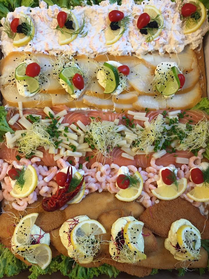 Skaldyrssalat, æg og rejer, rødspættefilet, varmrøget laks, røget Hellefisk