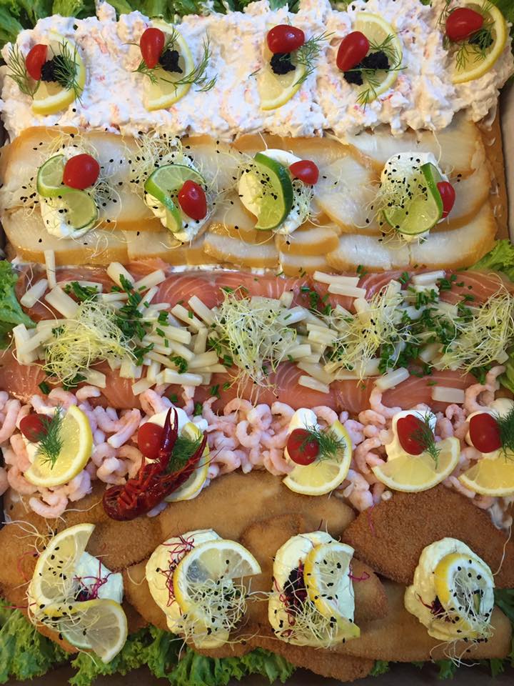 Skaldyrssalat, æg og rejer, rødspættefilet, fiskefrikadeller, skiveskåret laks