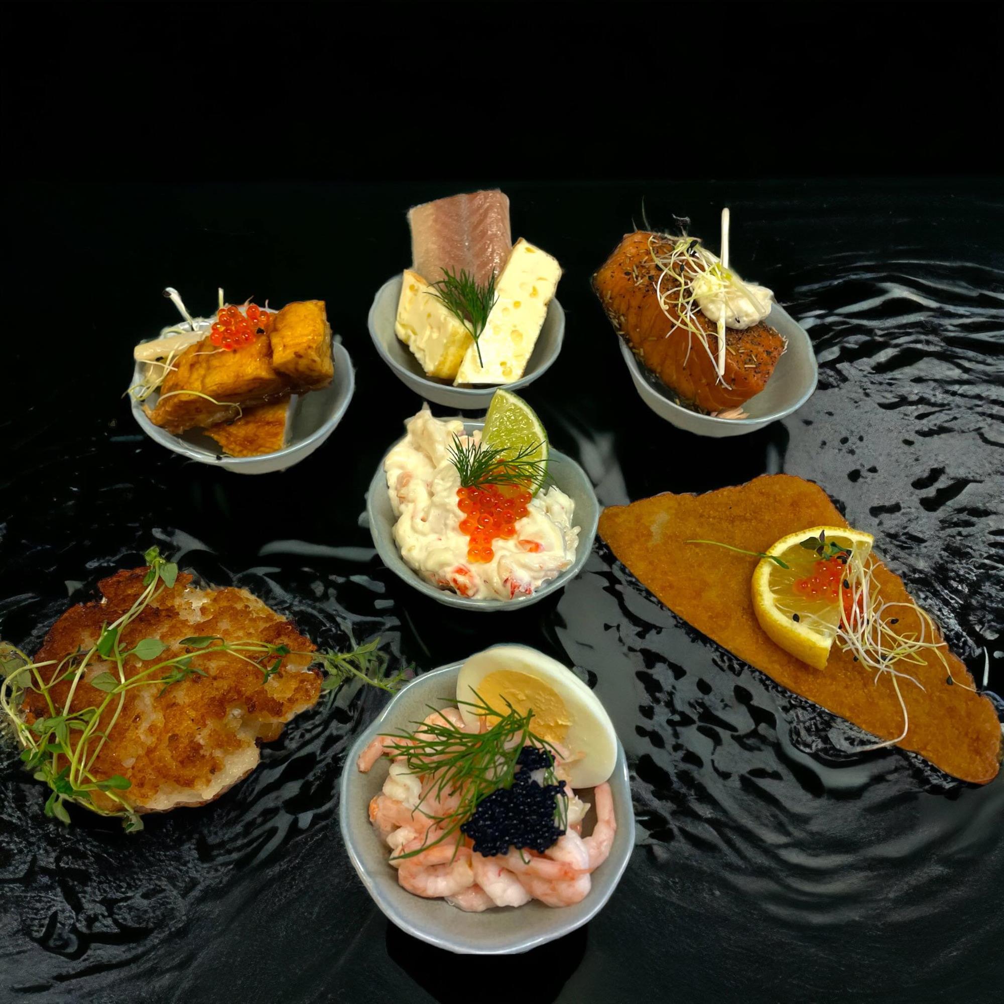 Rødspættefilet, laks, røget hellefisk, ålefilet, rejer, skaldyrssalat og fiskefrikadelle